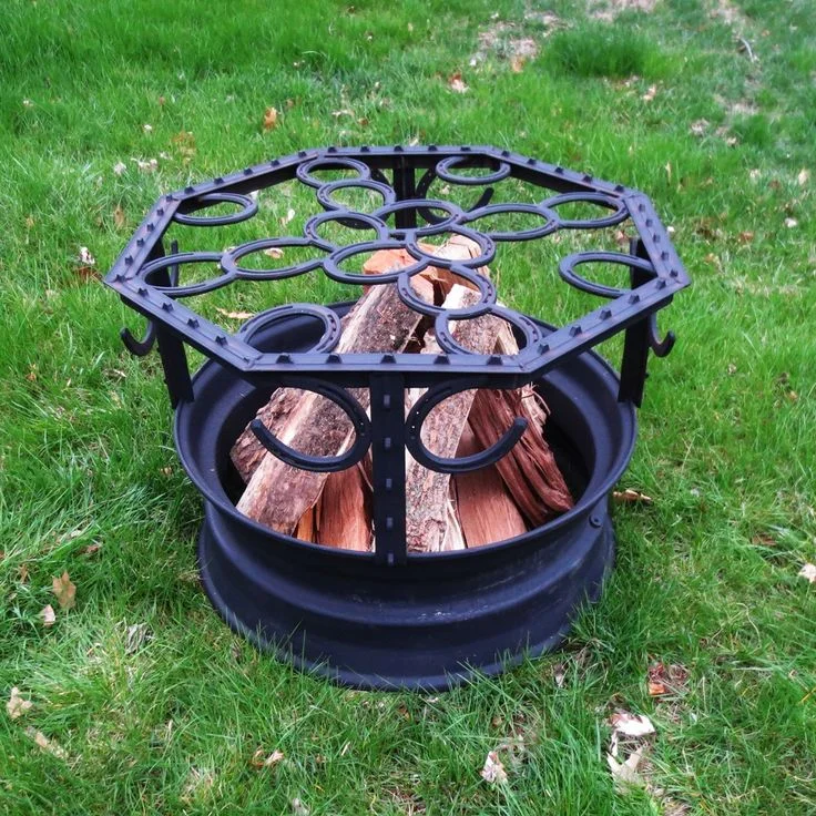 Much like the previous idea, the Western fire pit is created from recycled materials. This one combines a tire rim, some horse shoes, and an old fence post.
