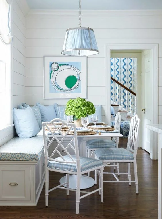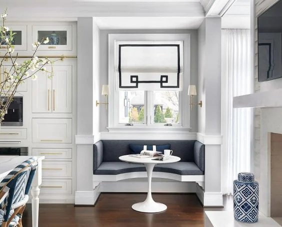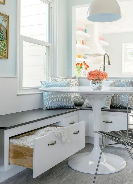 Why not use your breakfast nook banquettes as extra storage? This classy nook in white, gray, and blue is as comfortable as it is delightful.