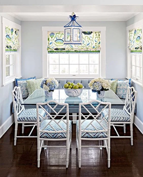Let this blue haven inspire you to start your day positively. From its charming farmhouse dining chairs and the blue cushioned bench to the colorful window drapes, this breakfast nook is just adorable.