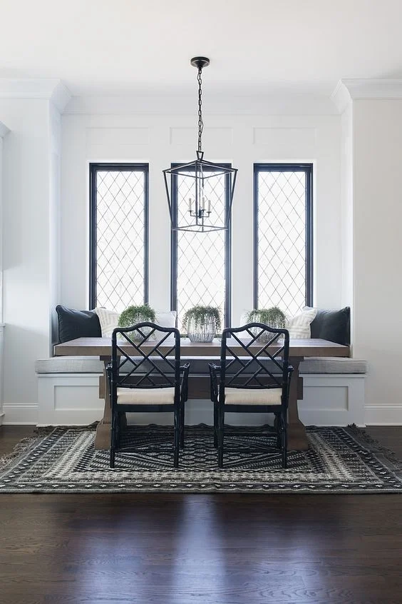 The wide, glass-paned window lets in the maximum amount of natural light. It also has built-in shelves, comfy wall benches, and wire-backed dining chairs.