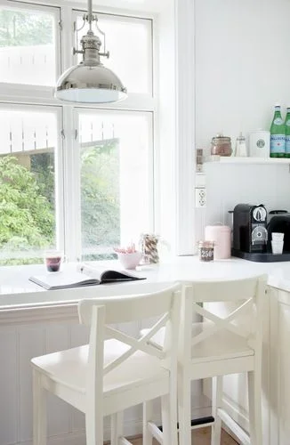 Streamlined, modern, uncluttered. This white kitchen window bar serves its purpose and more! It maximizes the space while letting you enjoy the morning view with your cuppa and favorite book.