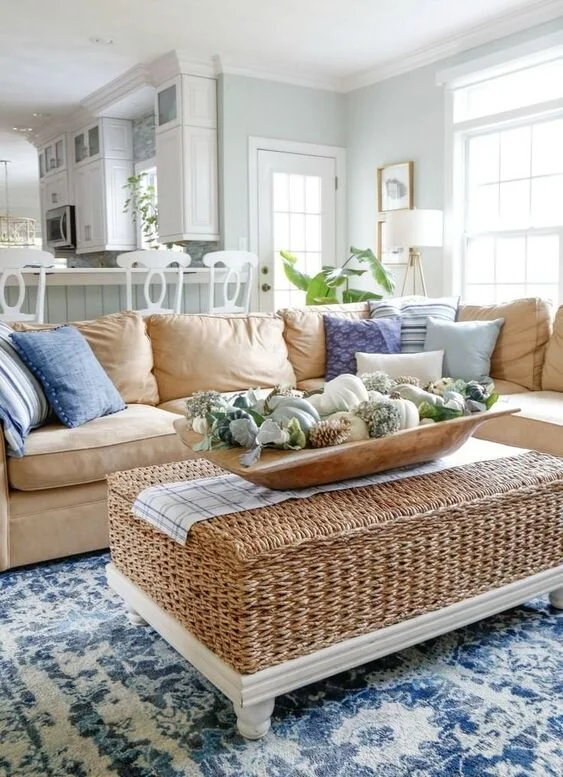 Charming and bright, this living room evokes the refreshing sea breeze and the laidback coastal vibe.
