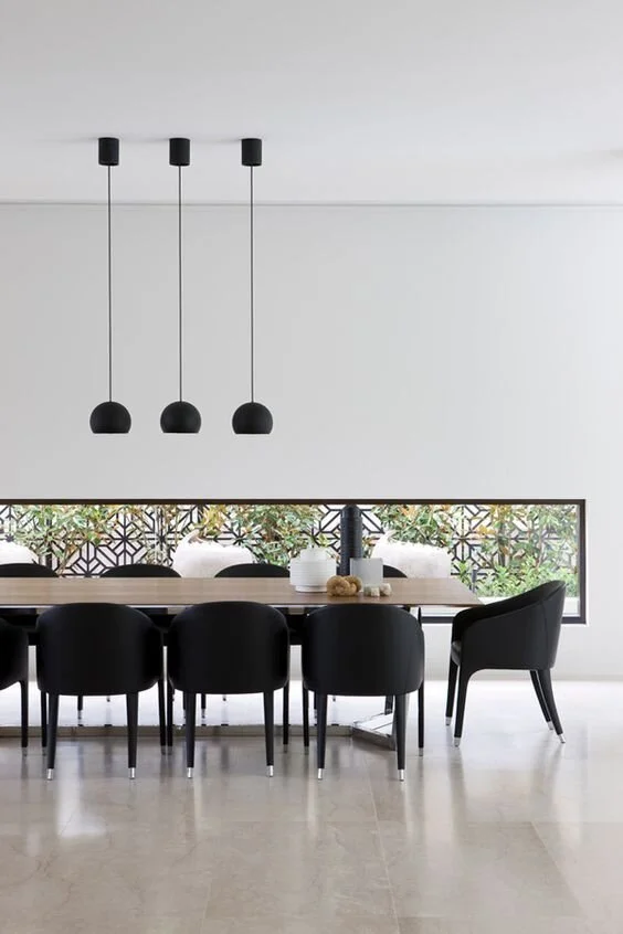 Sleek, minimalist, modern. The simplicity of the matte black design is a perfect match for the monochromatic interiors of this dining room.