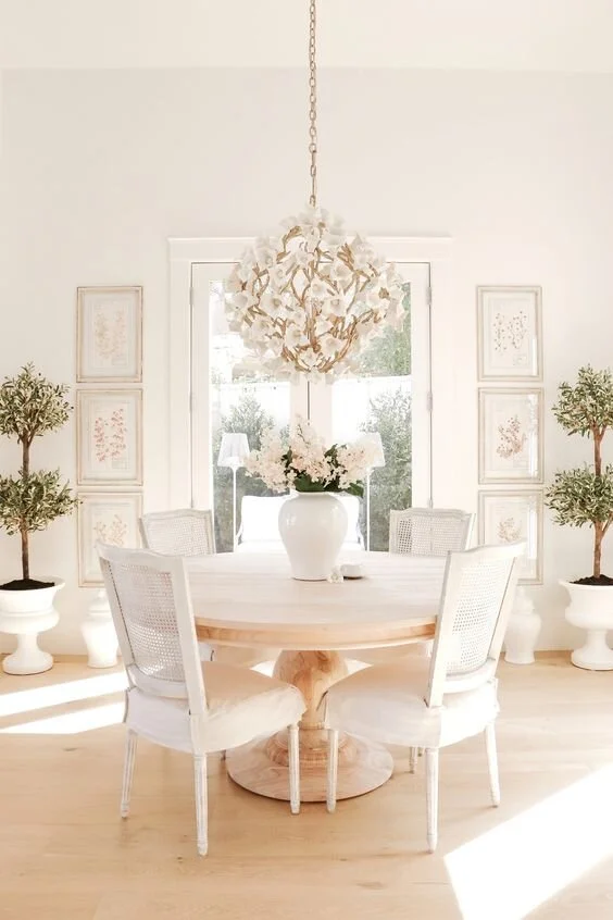 This is such a lovely chandelier to match an equally delightful dining room. This flower-inspired globe chandelier features golden vines and white petals.