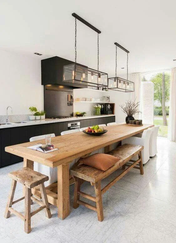 Complementing the rustic charms of the chandelier is a black solid wood dining table.