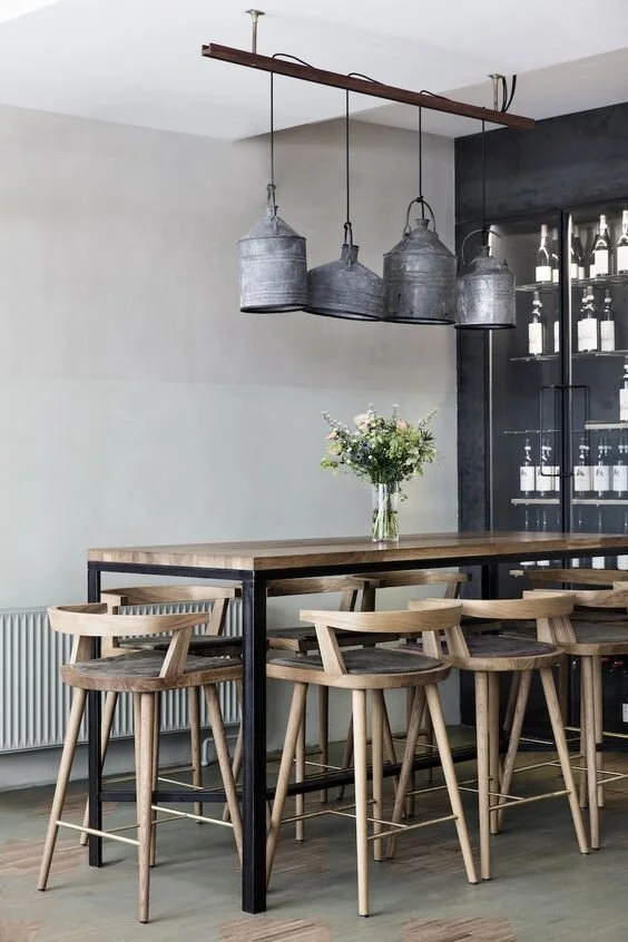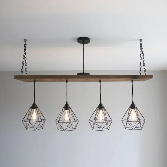 That edgy vibe of industrial design is so on-trend right now. Contrasting with the rustic charms of its wood base, the black iron geometric pendants are defined and totally stunning.
