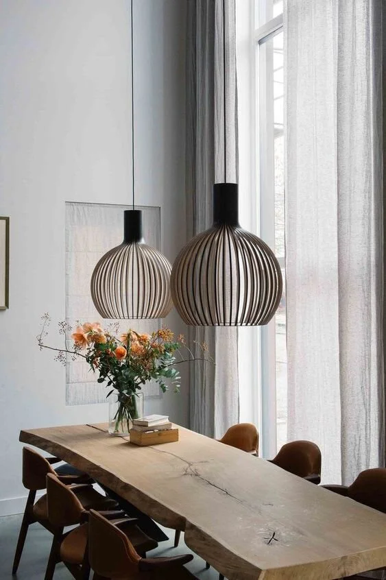 This is where the classic curves of a lampshade meet modern engineering. The thin vertical panels of wood or metal that form the globe create a dramatic illumination.