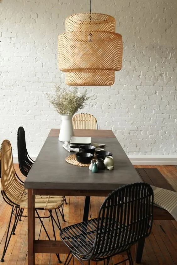 This charming bamboo weave pendant light brightens up the rustic industrial dining room. The natural bamboo tones are mirrored by the slat metal seats and the hardwood flooring.