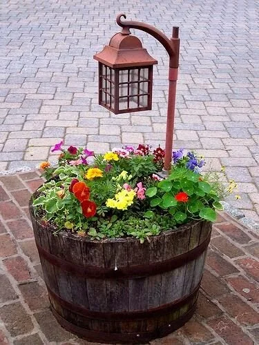 This particular barrel garden even has a lighting fixture and is filled with a mix of wonderful flowering shrubberies.