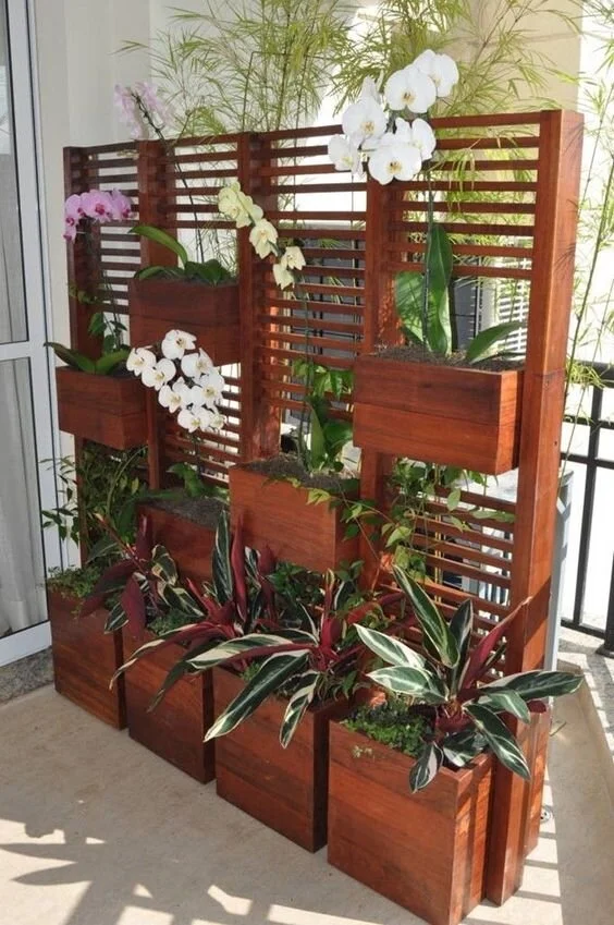 It’s set against a wall and has box planters at the bottom, smaller boxes at different heights, shelves for pots, and even bars for hanging plants. This is also such a clever idea for small patios or apartment balconies.