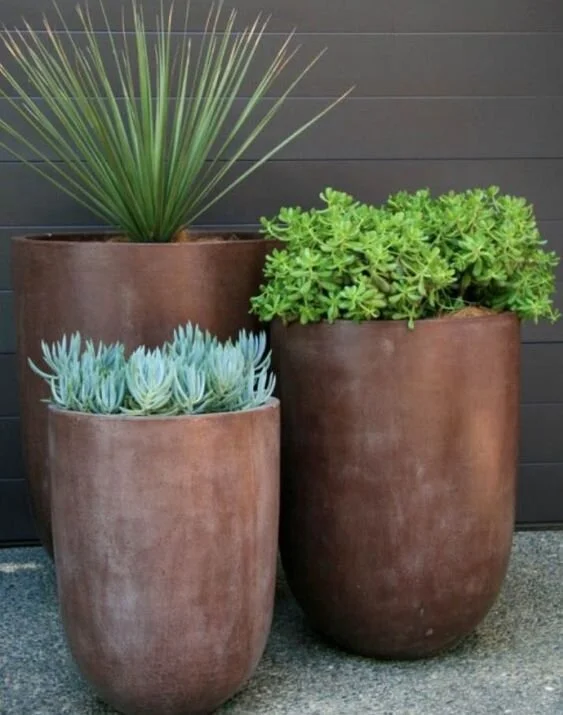 Metallic pots are the latest trend I’m seeing in gardens and landscaping. These huge, sleek pots come in silver, bronze, gold, and iron tones.
