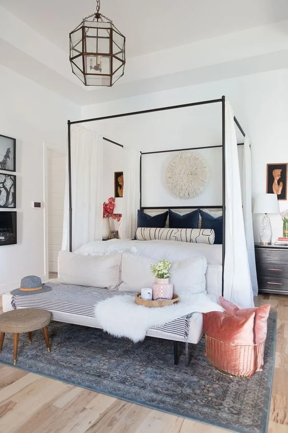 It also has beautiful white bed curtains, a blue vintage rug, and a fashionable bed bench. The wall accents, footstool, and gold basket complete this totally elegant bedroom.