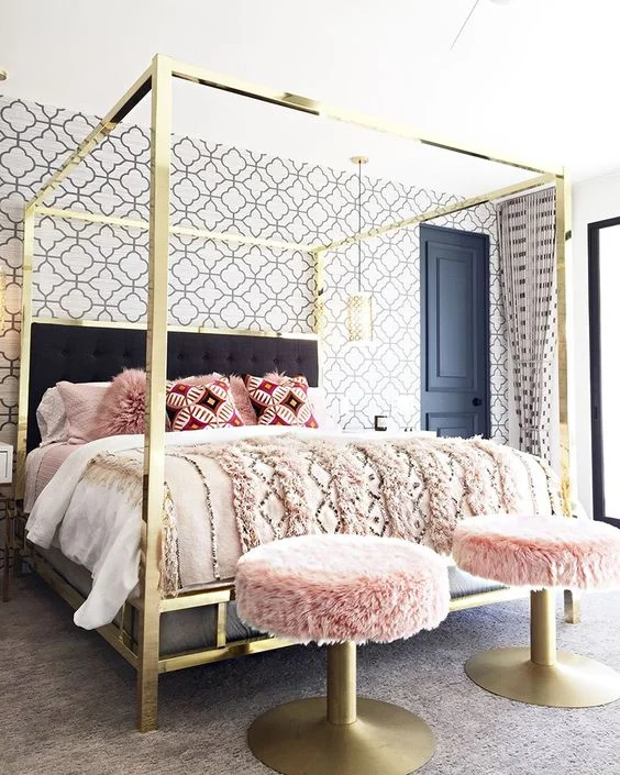 You can definitely impress your guests with this fabulous, glamorous, and luxurious guest room. The fuzzy footstools, eye-catching wallpaper, and beautifully dressed-up bed create such a dramatic show.