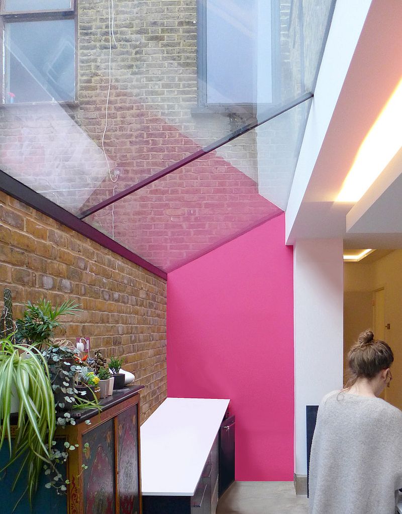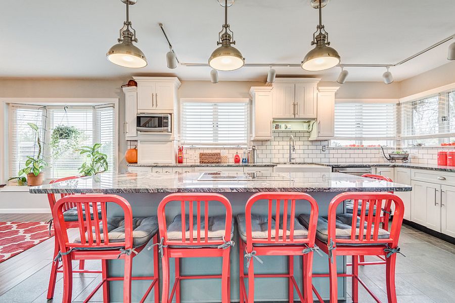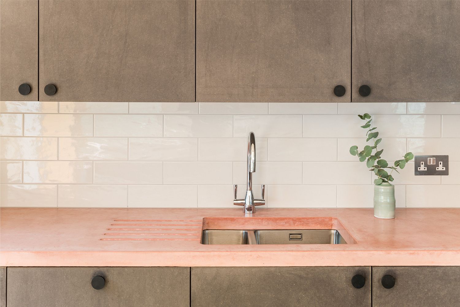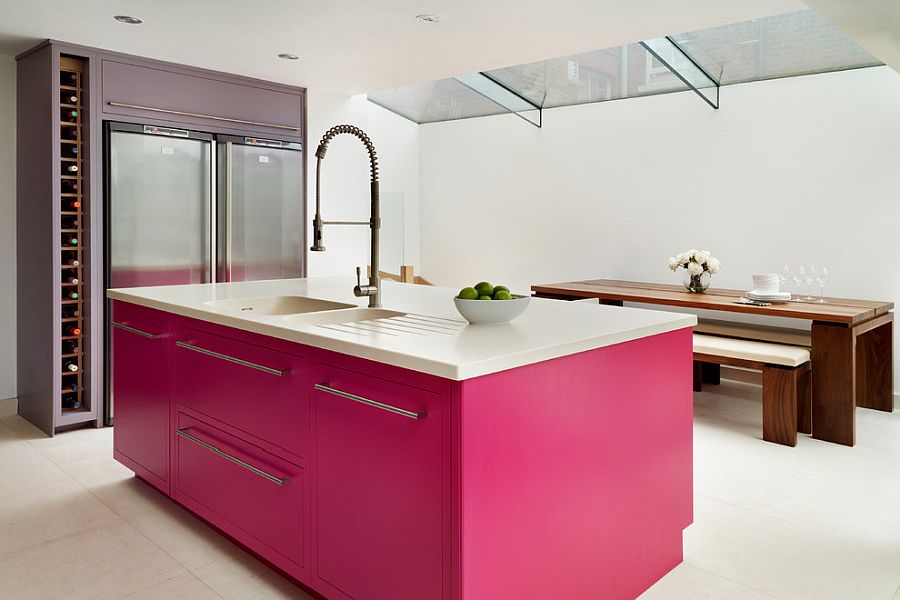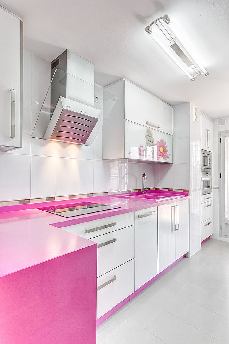 The shade of pink you choose is even more crucial when other bright colors are present in the kitchen. Repeating those accent colors elsewhere helps create a smart and cohesive kitchen that looks fantastic in an open plan living area.