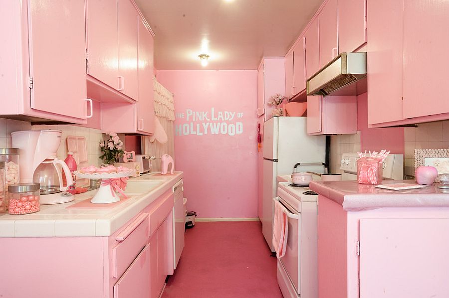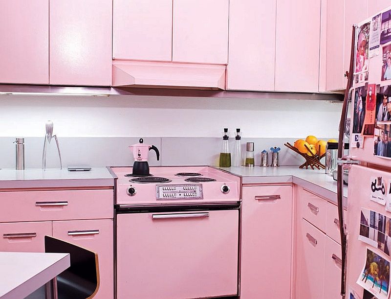 While placing a pink accent wall in a white kitchen is incredibly easy, creating an all-pink kitchen with matching cabinets and an island is much more of a commitment.