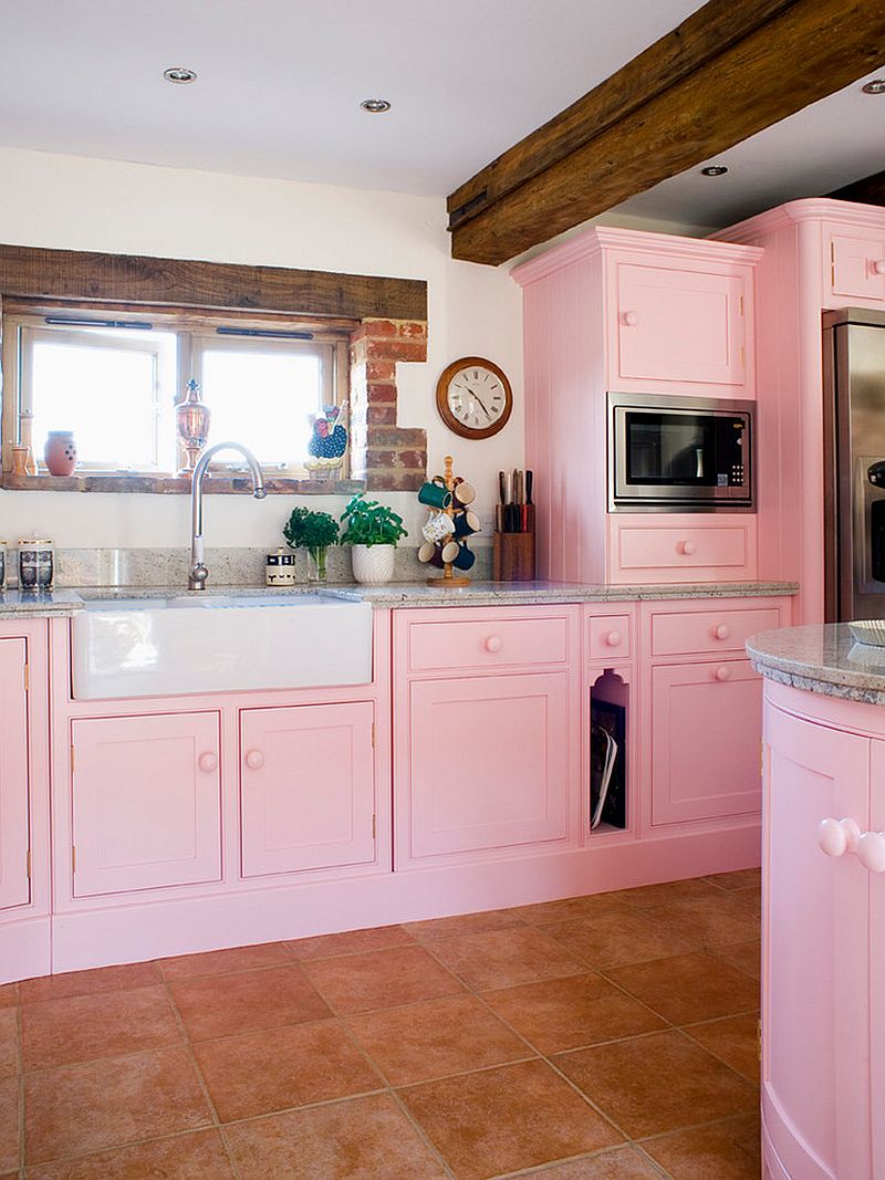 The style of the kitchen doesn’t seem to be a factor either, since everything from modern minimalist spaces to rustic and farmhouse kitchens look wonderfully inviting with a few touches of pink.