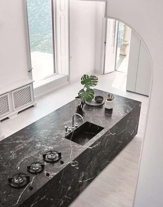 This stunning black marble kitchen island isn’t just nice to look at, it’s also awesomely multifunctional! It’s a worktable, dining table, sink counter, and stovetop all in one!