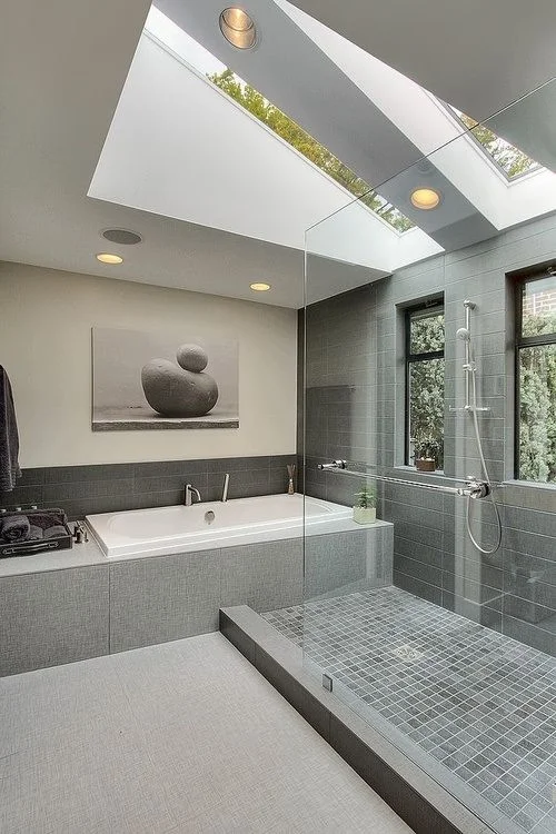 Even though darker bathrooms are trending, that feel is often balanced out by the rising popularity of skylights. I love them because they let in so much beautiful natural light.