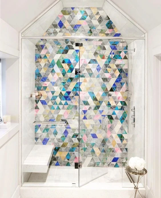 This colorful wall brings such a great measure of brightness and fun to an all white bathroom. The mosaic, made from triangle tiles in different hues, gives off a majestic stained glass look.