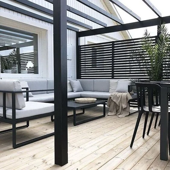 This cool and trendy deck has classic wood flooring, a black pergola and screens, white walls, and a modern gray sectional sofa. It just works!