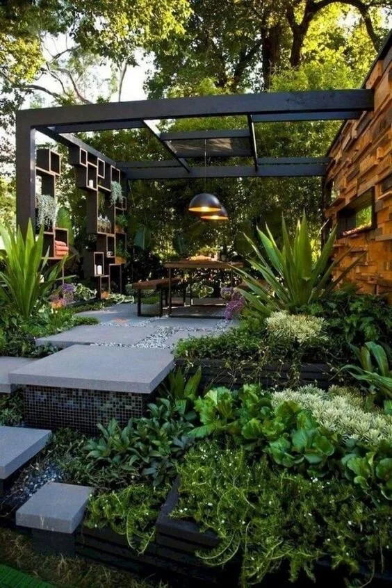 This patio works perfectly with its surroundings, using a black pergola, a wood-themed wall, and stone pavers for the flooring. It just blends right in.