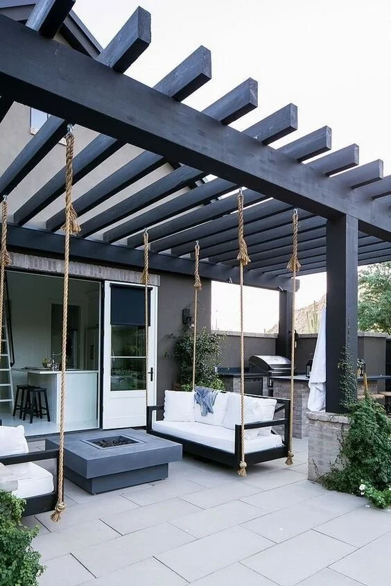 Why would you settle for ordinary chairs when you can have swings? This modern patio is so far from ordinary, and it’s all thanks to its modern concrete firepit, black pergola, and those huge, comfy sofa swings.