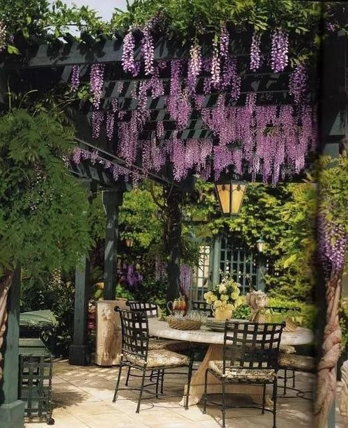 Climbers and pergolas just come together so dreamily! Wisteria shrubs are amazing for this because they add color, dainty flowers, and a glorious scent to your whole garden.
