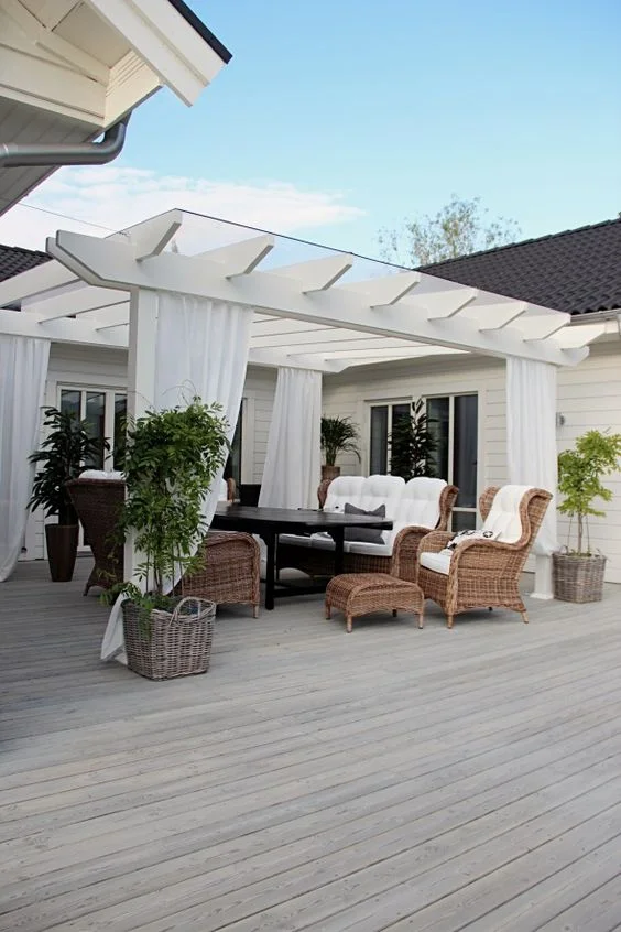 This basic white pergola becomes instantly more interesting with the addition of white curtains. Then, adding wicker furniture completely transforms it into something quaint, chic, and totally adorable.