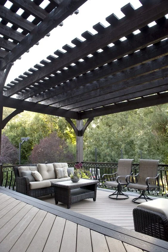This is a classic pergola that becomes totally extraordinary with the addition of lattice privacy panels and a sharp black furniture set.