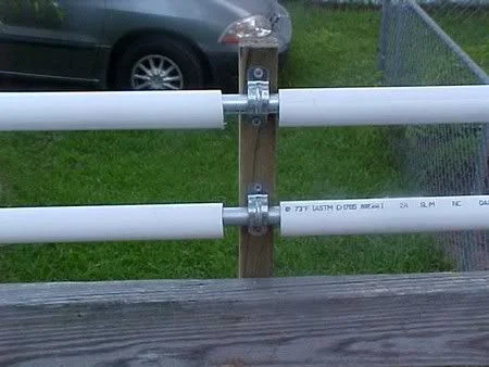 This is such a clever contraption to keep cats from going over the fence. The top of the fence has two cable wire lines installed, and each one has a PVC pipe attached.