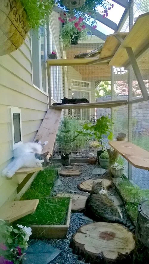 A typical catio usually includes perches, ramps, catwalks, and pots with cat-friendly plants like cat grass, catnip, and lemongrass. It’s such a great way to show your cats some love!