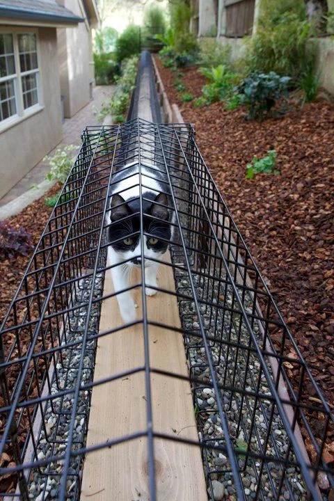That PVC pipe will actually roll and cause the cats to drop if they try to hold onto it and cross. So, your inside cats stay in and the outside cats stay out. So smart!