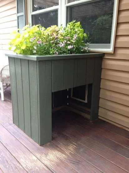 This flower box is such an effective and creative way to hide a pet door from plain sight. I love this! It also helps shield the entry from rain, sleet, and snow.