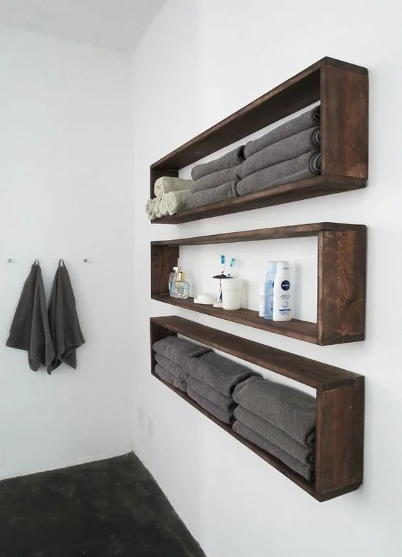 Floating shelves are a common feature in many small bathroom designs. These floating box shelves provide much-needed storage and organizing space in smaller bathrooms without cramping up the walls.
