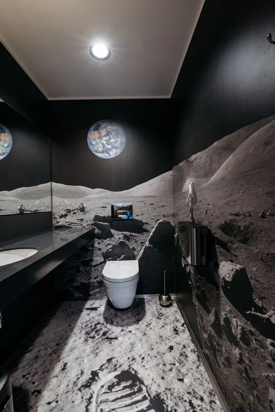You can transform a small, generic bathroom into something spectacular and magical with an epic mural. This bathroom features a stunning and out-of-this-world moonscape mural!
