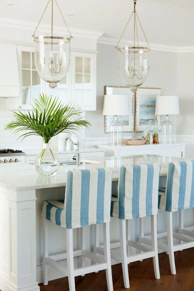 Making your bar seats the focal point of the kitchen is such a clever design move. I find that bright red, black, or deep blue seats make a huge visual statement against crisp white surroundings.