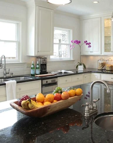 I love this simple trick. Fruits are so colorful, perky, and fragrant, making them a wonderful addition to a more serious kitchen.